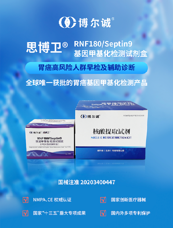 項(xiàng)目期間,博爾誠(chéng)將提供旗下消化道癌癥早檢系列產(chǎn)品,包括數(shù)萬(wàn)人份的“大便隱血和幽門(mén)螺旋桿菌抗原聯(lián)合檢測(cè)試劑盒(FIT-HP-Ag)”、“思博衛(wèi)®RNF180/Septin9基因甲基化檢測(cè)試劑盒”,共同推進(jìn)國(guó)家消化道腫瘤聯(lián)合篩查創(chuàng)新示范區(qū)項(xiàng)目開(kāi)展。