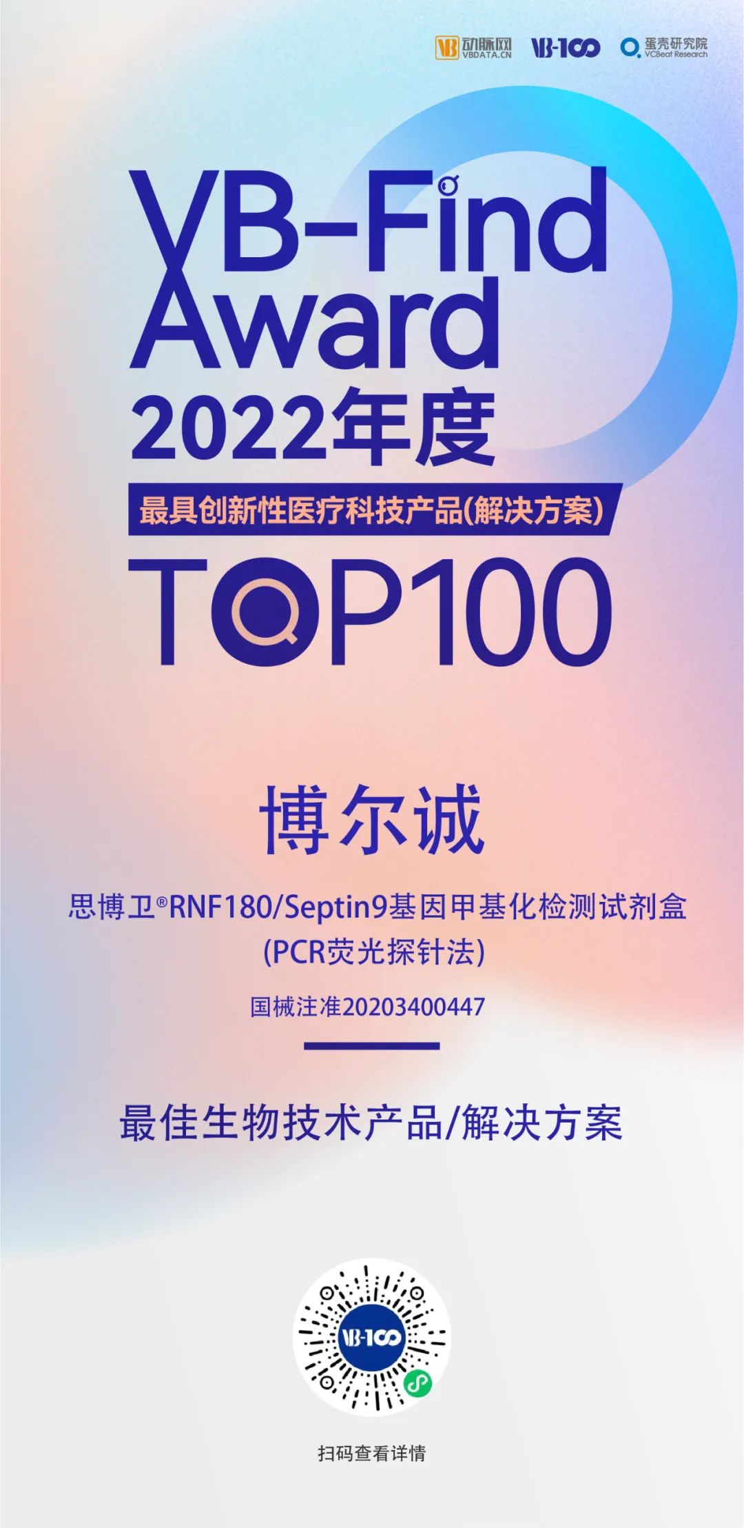 2022年12月14日-15日,由動(dòng)脈網(wǎng)、VB-100、果殼研究院主辦的2022醫(yī)療科技世界峰會(huì)于蘇州召開(kāi)。“VB-FindAward:2022年度最具創(chuàng)新性醫(yī)療科技產(chǎn)品(解決方案)TOP100”榜單也于此盛會(huì)上正式發(fā)布。此次榜單聚焦生物技術(shù)、數(shù)字及信息技術(shù)、新材料與智能制造技術(shù)三大領(lǐng)域,基于應(yīng)用價(jià)值、驅(qū)動(dòng)支持、創(chuàng)新迭代、互動(dòng)傳播四個(gè)維度,評(píng)選出最具創(chuàng)新性的產(chǎn)品和解決方案。憑借在癌癥早篩早檢領(lǐng)域的突破性領(lǐng)先技術(shù),博爾誠(chéng)旗下思博衛(wèi)® RNF180/Septin9基因甲基化檢測(cè)試劑盒(PCR熒光探針?lè)?成功斬獲最具創(chuàng)新性醫(yī)療科技產(chǎn)品獎(jiǎng)項(xiàng)。