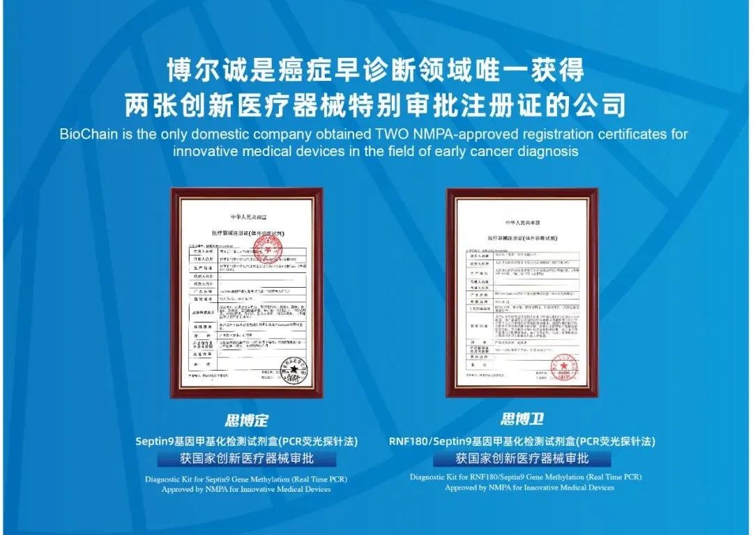 多年以來(lái),博爾誠(chéng)不忘“讓更多人遠(yuǎn)離重大疾病”之初心,從未停止創(chuàng)新的腳步,不斷針對(duì)消化道癌癥早篩早診進(jìn)行探索。2015年,博爾誠(chéng)旗下結(jié)直腸癌早檢產(chǎn)品思博定®Septin9基因甲基化檢測(cè)試劑盒(PCR熒光探針?lè)?通過(guò)NMPA創(chuàng)新醫(yī)療器械特別審批(國(guó)械注準(zhǔn)20153401481),是我國(guó)首款獲批的結(jié)直腸癌基因甲基化檢測(cè)試劑盒,現(xiàn)已納入福建省、北京市、上海市等多地醫(yī)保。博爾誠(chéng)自主研發(fā)的食管癌甲基化基因檢測(cè)試劑盒現(xiàn)的臨床試驗(yàn)已基本完成,該試劑盒通過(guò)聯(lián)合檢測(cè)多個(gè)食管癌相關(guān)基因的甲基化水平,可實(shí)現(xiàn)對(duì)早期食管癌的高效檢測(cè),有望填補(bǔ)早期食管癌甲基化檢測(cè)空白。
